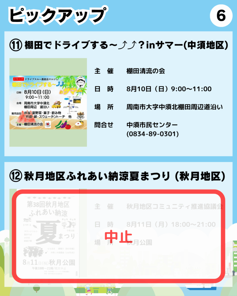 ●8/11(月・祝)「秋月地区ふれあい納涼夏まつり」(秋月地区)中止