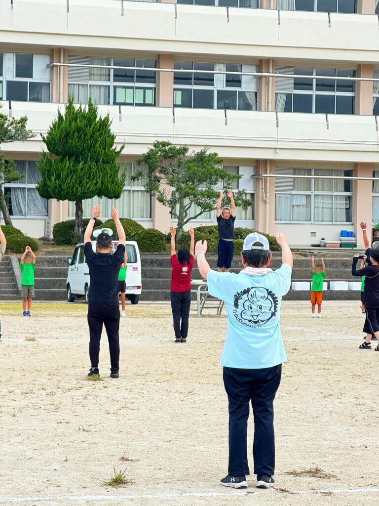須々万地区では毎月4日を“健康すすまの日”としていて、夏休み期間中にあたる8月4日には、沼城小学校に集まり「みんなでラジオ体操」を行っています。朝早い時間にも関わらず、子どもからお年寄りまで80人近くのみなさんが参加されていました。
