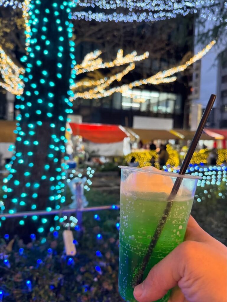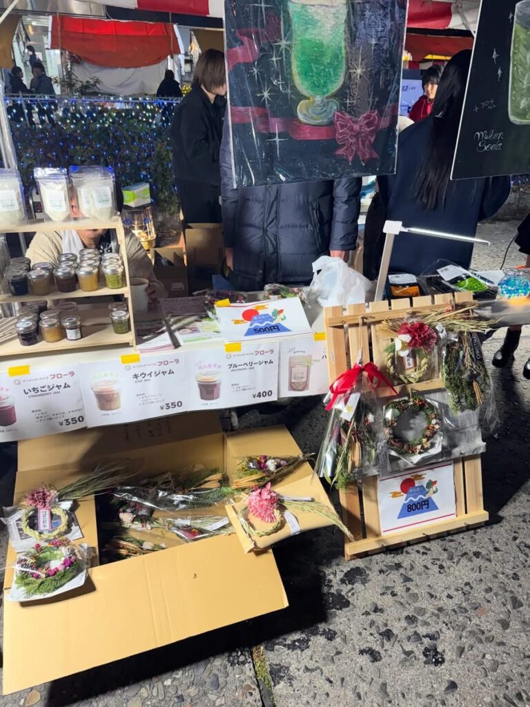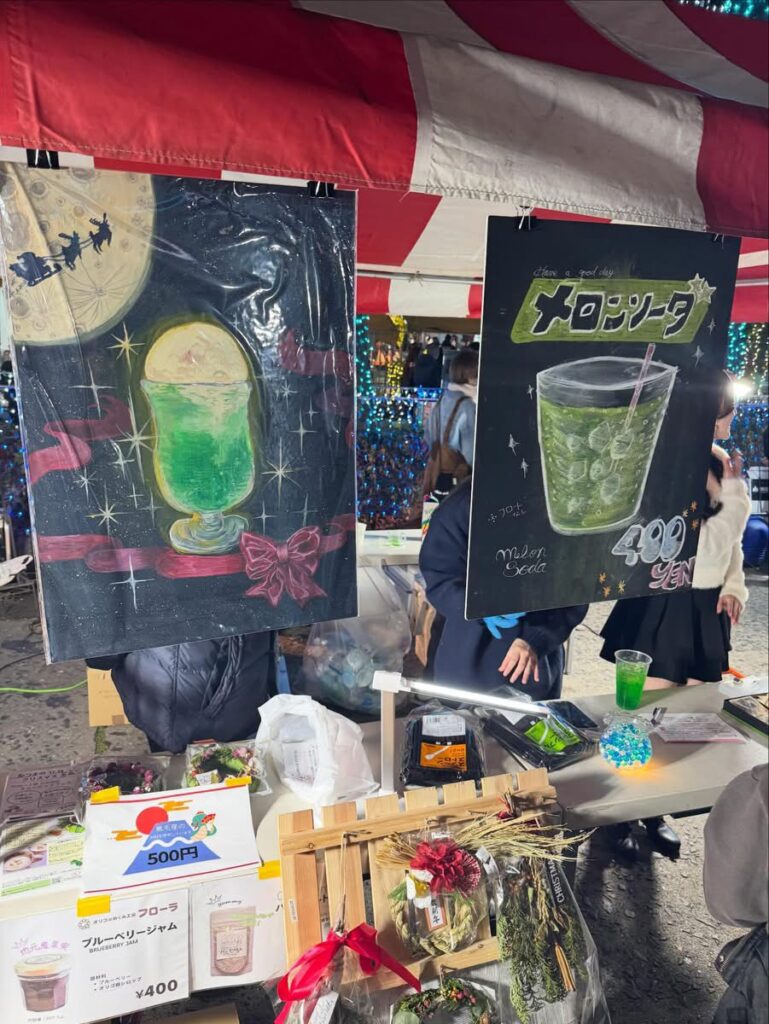 今回販売したのは、ツリー祭りのイルミネーションとの”映え”を意識したメロンクリームソーダやメロンソーダに、ホットレモネードの他、手作りの正月飾りなども。