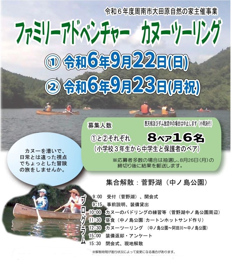 お申し込みにあたり、「主催事業にお申込み・参加される皆様へ」をご一読ください。 諸事情により、事業を急遽中止または延期させていただく場合がございます。 令和6年8月26日(月)必着で、下記の事項を記入し、はがき、FAX、申込フォームのいずれかでお申し込みください。 ※申し込みフォームはここをクリックしたら立ち上がります※・申し込みを希望する事業名 ・参加者氏名 ・年齢または学年 ・郵便番号、住所 ・電話番号 ・希望日(@9/22(日) または A9/23(月祝)) ・参加希望の動機 申込フォームにて応募された場合、送信後に自動返信メールが入力されたアドレスに届きます。届かない場合は、お手数ですが直接お電話でお問い合わせください。 〒745-0511 周南市中須北3194番地 周南市大田原自然の家 「カヌーツーリング」係電話番号 (0834)89-0461Eメール ootabara@ccsnet.ne.jp |