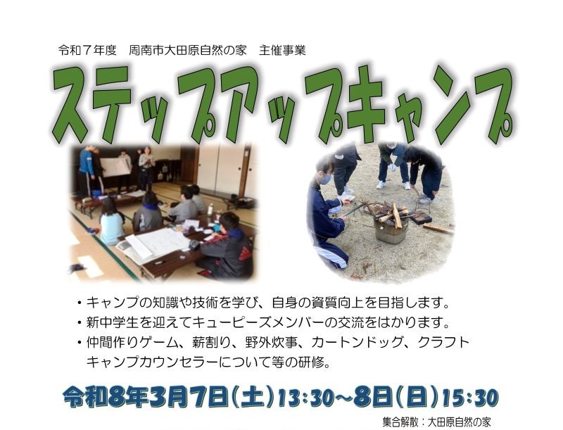 お申し込みにあたり、主催事業にお申し込み・参加される皆様へをご一読ください。 諸事情により、事業を急遽中止または延期させていただく場合がございます。 申込フォーム又はハガキに必要事項を記入して、2/23(月)までにお申込みください。 【必要事項】氏名、ふりがな、性別、新中学校名、郵便番号と住所、電話番号、保護者氏名、参加動機 キューピーズ入会の有無、ステップアップキャンプ参加の有無