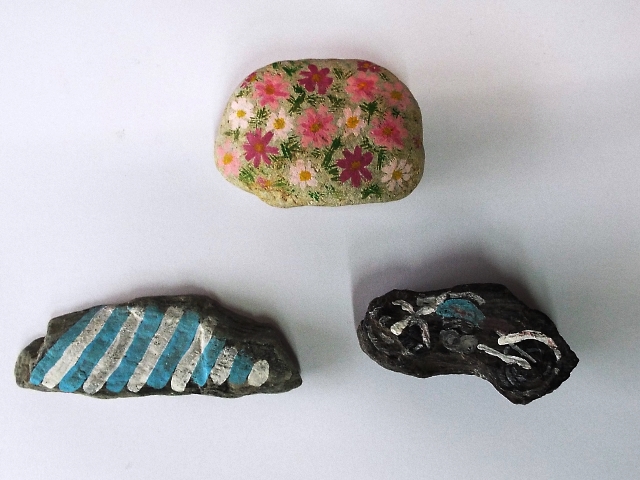 | ストーンアート | 石の形をいかして石にアクリル絵の具で描きます。 川遊びで石を拾うこともできます。 <作品例> |
