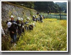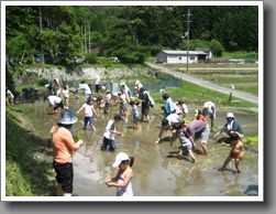 自然の家では、畑のほかに田んぼで米も作っています。毎年、主催事業で田植え〜収穫をしています。 収穫したお米(もち米)はもちつきをしてみんなで食べます。 苗作り〜田植え〜収穫までと、植えてから口に入るまでの一貫した体験をすることができます。 |